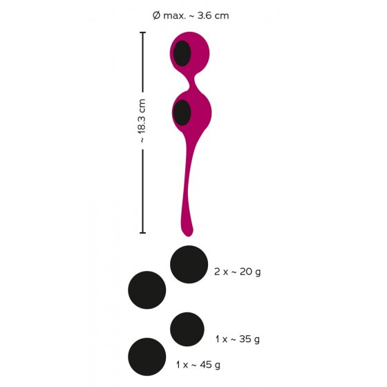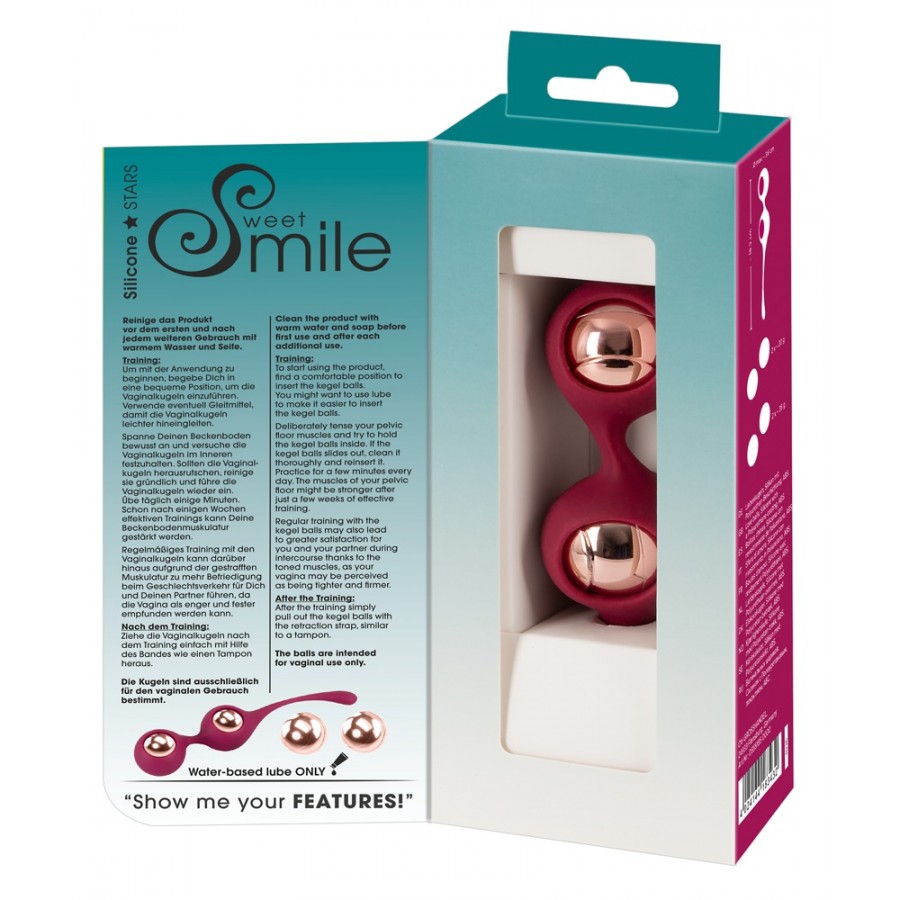 Οι μπάλες προπόνησης Kegel με επιπλέον βάρη από το Sweet Smile προσφέρουν τόνωση και προπόνηση για αρχάριους και ειδικούς. Το σετ μπάλες αγάπης είναι κατασκευασμένο από ένα βελούδινο μαλακό κάλυμμα σιλικόνης (24 g) και 4 μπάλες (2 x 20 g, 1 x 35 g και 1 x 45 g) που μπορούν εύκολα να εισαχθούν και να αφαιρεθούν. Τα διαφορετικά βάρη σημαίνουν ότι είναι δυνατή η σταδιακή και αποτελεσματική προπόνηση του πυελικού εδάφους.
