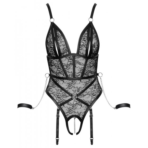 Σώμα ανάρτησης Ouvert της Cottelli BONDAGE από απαλή ελαστική φλοράλ δαντέλα σε όψη λουριού με ματ λεπτομέρειες και αξεσουάρ σε ασημί χρώμα. Σχισμές κούπες με μικρούς γάντζους για εύκολο άνοιγμα. Ο εντελώς ανοιχτός καβάλος διαθέτει αφαιρούμενη, διεγερτική αλυσίδα καβάλου. Οι εσωκλειόμενες μαλακές χειροπέδες με τις κουμπωμένες αλυσίδες με γάντζο μπορούν εύκολα να γαντζωθούν στους πλαϊνούς δακτυλίους της ζώνης μέσης. Μανσέτες με ρυθμιζόμενα κουμπώματα με γάντζο και βρόχο. Ιμάντες και τιράντες προσαρμόζονται επίσης - οι τιράντες μπορούν επίσης να αφαιρεθούν εντελώς.