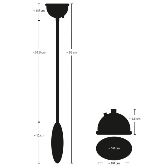 Πλήρες μήκος 56 cm; φλιτζάνι μήκους 6,5 cm, εσωτερικές διαστάσεις 5,3 x 2,7 cm. σωλήνας μήκους 37,5 cm. πίνακας ελέγχου μήκους 12 cm. 113 γρ Σιλικόνη, PU, ​​ABS.