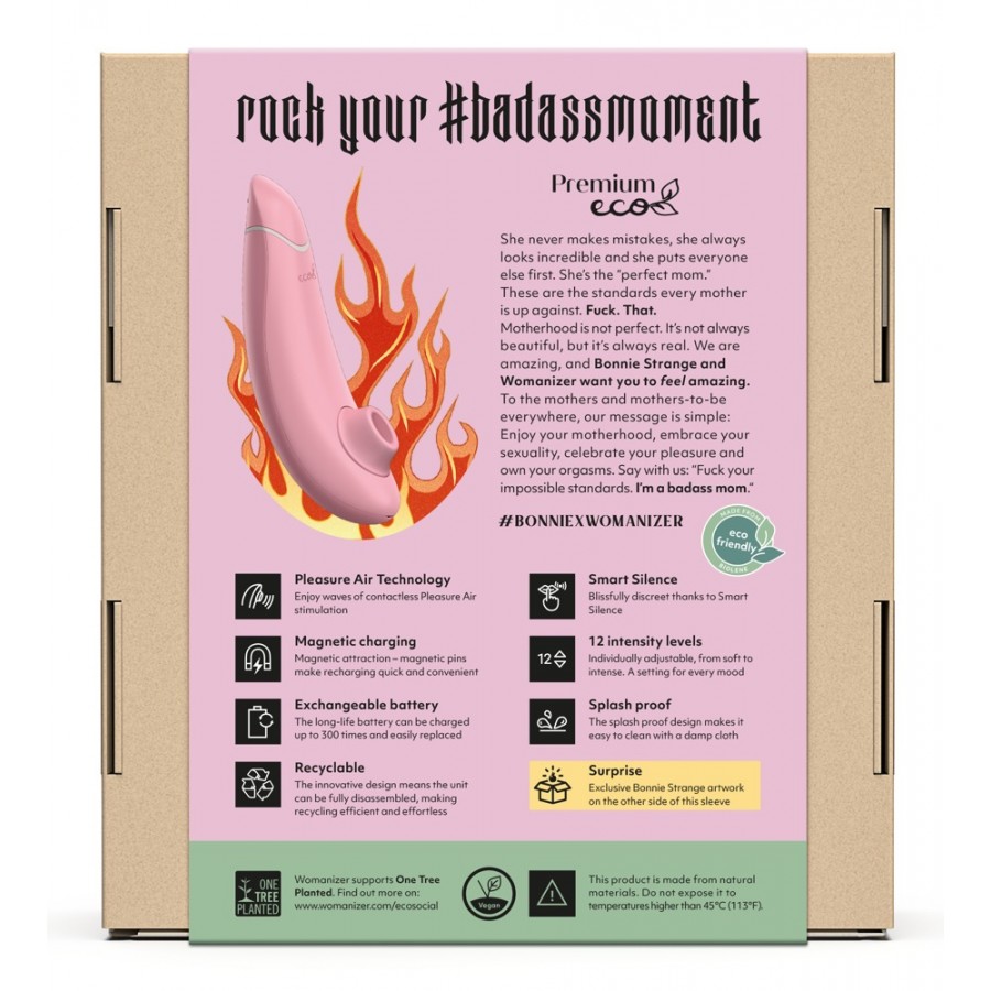 Το Womanizer Premium eco είναι ένας ισχυρός διεγέρτης κυμάτων πίεσης με 12 διαφορετικές εντάσεις και τεχνολογία Smart Silence. Η πατενταρισμένη τεχνολογία Pleasure Air παρέχει ακριβή, ανέπαφη διέγερση της κλειτορίδας. Ο αισθητήρας μέσα στο Premium eco σημαίνει ότι αρχίζει να διεγείρει κάποιον μόνο όταν έρχεται σε επαφή με το δέρμα. Θα απενεργοποιηθεί αυτόματα μετά από 5-10 λεπτά όταν δεν χρησιμοποιείται (ανάλογα με την ποσότητα της μπαταρίας που έχει απομείνει). Αυτό μπορεί να παρακαμφθεί εύκολα, π.χ. πατώντας ένα από τα επίπεδα έντασης. Αδιάβροχο στο πιτσίλισμα.